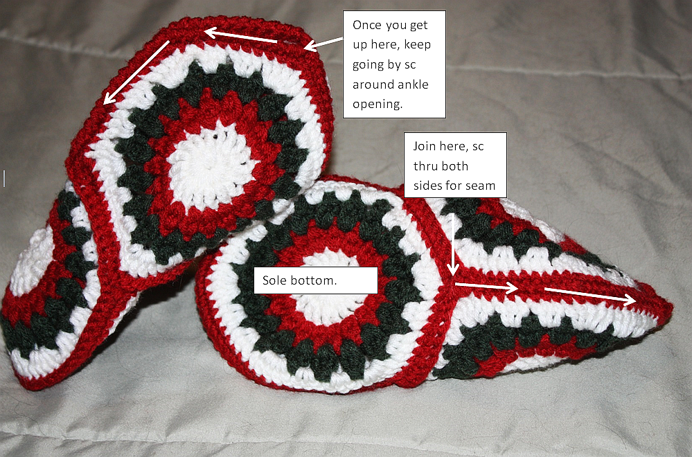 Note: you can add 2 more hexagons to the ankle area to make ankle booties.  Guys tend to like the boots better & the tops can be folded down for even more variation on the boot look.