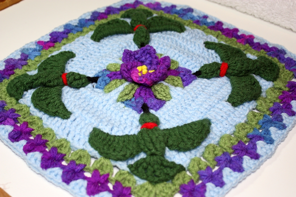 The Hummingbirds in Flight is a brand new 12″ square made in crochet overlay technique that creates a 3D effect.  This pattern is in testing and will be made available for sale on my Ravelry and Etsy stores.  I’m hoping this will be just the first of a series of these overlay squares.