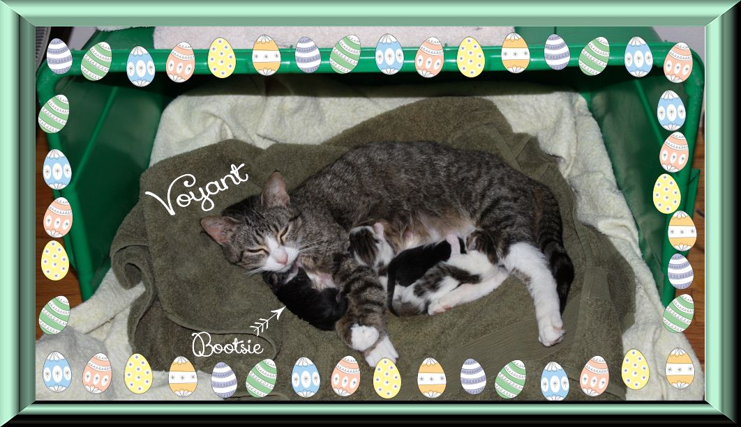 Well here it is.  My second Easter design project which ran late.  As you can see the bunnies multiplied and so did the eggs and baskets.  That’s not all that multiplied this Easter!  As luck would have it, a stray malnourished pregnant cat took up living in our hedges so I was tasked to get her into the house and try to fatten her up.  She had kittens the Thursday before Easter (see photo below).  That little one I named Bootsie had to be bottle fed because he was too weak.  So between all the new cat & kittens ordeal I managed to finish this Easter Afghan Stitch pattern and publish it.